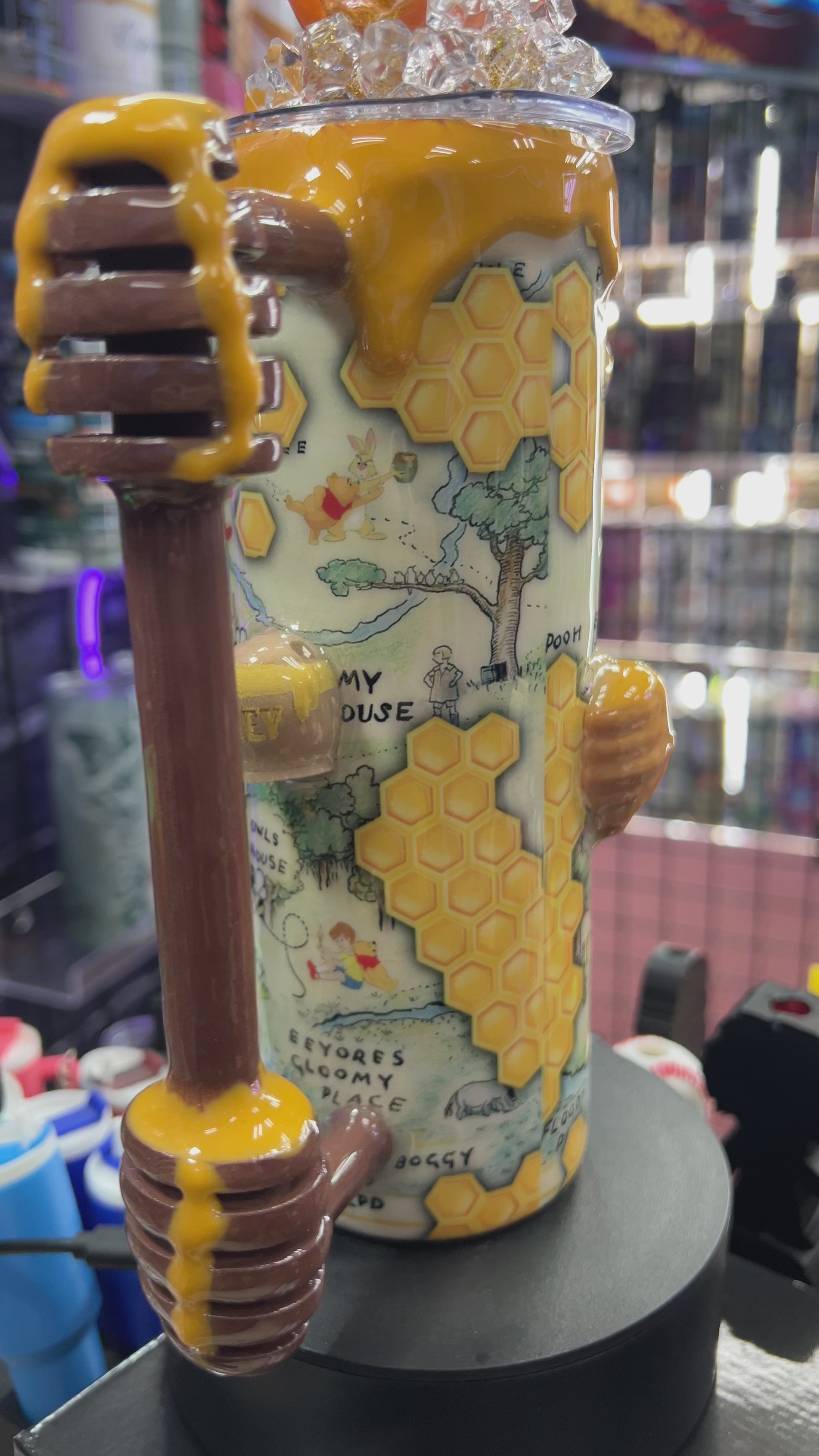 20oz dressed with 3d Winnie the Pooh 3d ornaments and Honey Dipper handle. These are hand painted .